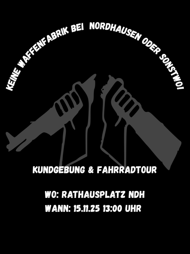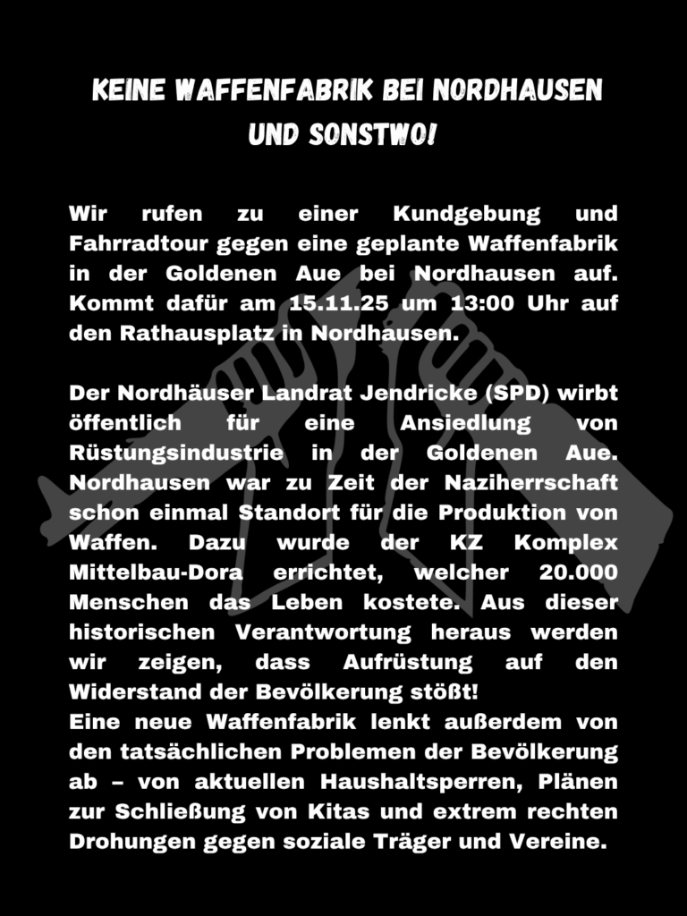 Anstehende Termine Kundgebung gegen die Ansiedlung einer Waffenfabrik in Nordhausen! Wann: 15.11.25 , 13:00 Uhr Wo: Rathausplatz Nordhausen